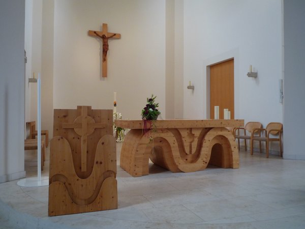 „Am Altar sind die bewegten Linien ein Ausdruck des Lebens, des Bewegten, in der Mitte stehen das Kreuz und der Kreis (als Ganzheitszeichen), mit denen wir erst die Schöpfung verstehen. Der Ambo nimmt die bewegten Linien des Lebens auf. Sie dienen als Grundlage, aus denen dann der rechteckige Korpus mit dem Kreuz aufsteigt.“