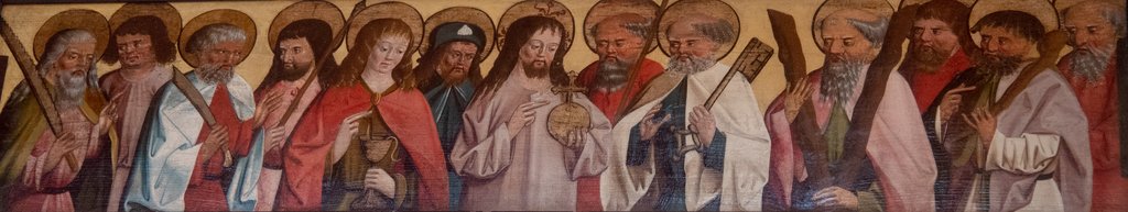 Das Bild mit den zwölf Aposteln und Jesus in ihrer Mitte, das über dem Eingang zur Sakraments- und Marienkapelle hängt, ist im 15. Jahrhundert im fränkisch-nürnbergischen Raum entstanden. Der unbekannte Künstler verwendete Temperafarben auf einem Holzuntergrund. Der Rahmen des Bildes stammt aus der Ursprungszeit. Das Kunstwerk diente früher als unterster Teil eines Altarflügels. Daher waren seinerzeit die zwölf Apostel mit Jesus quasi auf der Höhe des Altars positioniert, als ob der Künstler sie um den Altartisch gruppiert und gemalt hätte. Mitten in der Gruppe steht Jesus, einen Reichsapfel tragend, als Zeichen seiner Herrschaft; mit seiner rechten Hand deutet er darauf hin. Der Reichsapfel ist mit einem Kreuz versehen. Mit diesem Hinweis wird dem Betrachtenden bewusst, dass die wahre Herrschaft Jesu durch seine Hingabe am Kreuz zu verstehen ist. Somit passt das Bild wunderbar zum Patrozinium der Binninger Heilig Kreuz Kirche.