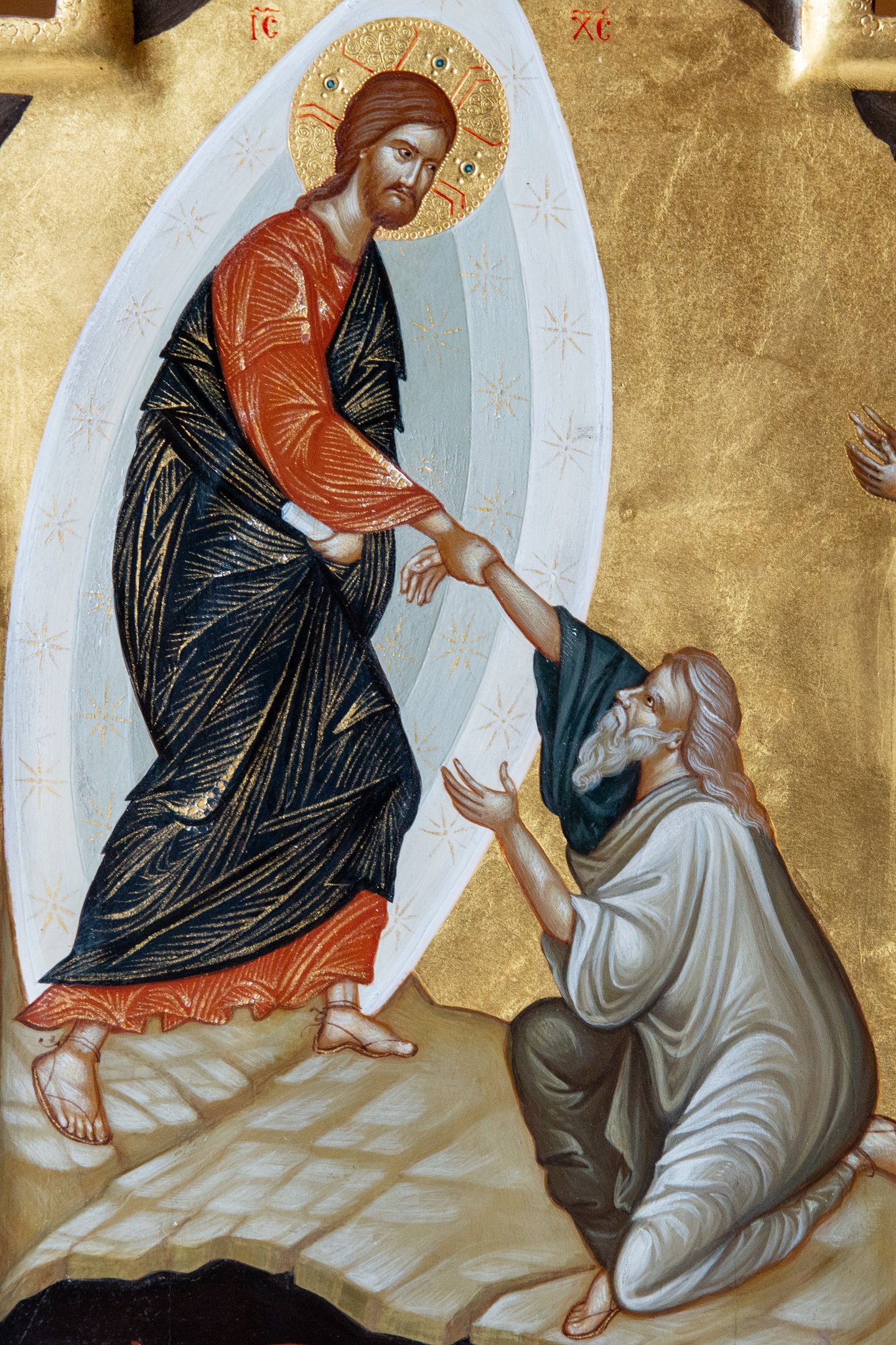 Auf der Rückseite des Kreuzes ist eine Auferstehungsszene bildlich festgehalten: Christus befreit einen Menschen vom Tod und richtet ihn auf. Auf dieser Seite des Ikonenkreuzes sind die vier Evangelisten mit den ihnen eigenen Symbolen von Adler, Löwe, Stier und Engel in den Kreuzesenden versinnbildlicht.