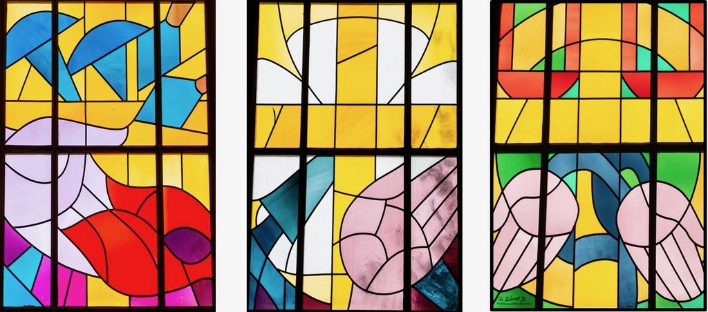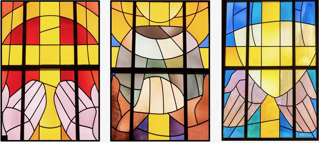 Auffallend in der Kirche sind die farbigen, modernen Kirchenfenster, die Christof Zünd 1990 zu den «Seligpreisungen» des Neuen Testamentes geschaffen hat. «Die Bilder in den Fenstern sollen dazu beitragen, Jesu Worte der Bergpredigt anzunehmen, zu überdenken und zu leben. In jedem Bild finden wir das Kreuz, Jesus, der alles Leid gelitten und überwunden hat. In verschiedenen Haltungen finden wir menschliche Hände, die wirken, was uns Menschen durch die Kraft Gottes möglich ist. Die verschiedenen Zeichen zeigen auf, was vertrauendes Tun fertig bringt und uns den Verheissungen Jesu zuführt. Ein Bild trägt keine Hände, Gott wirkt. Der Lebensbaum als Zeichen des Lebens, das von Gott kommt», so schrieb Christoph Zünd selber zu diesen zwölf Fensterbildern. Das Fenster «Gott gibt uns Leben im Zeichen des Lebensbaumes» stand Pate zum dem seit 1.1.2021 offiziellen Logo und Siegel der Pfarrei Heilig Kreuz. Neben den zehn Fenstern zur Bergpredigt finden sich auf der Orgelempore zwei Fenster zur Thematik des Apostolischen Glaubensbekenntnisses.