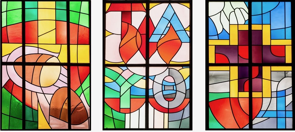 Mitte / rechts: Darstellen des Glaubensbekenntnisses in zwei Bildern.